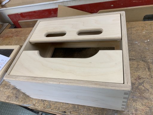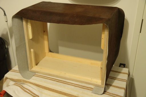 Kaikki seinät ja takaosa tukevasta vanerista ja etuseinä hiukan ohuemmasta vanerista. Rimoilla nostetaan etukangas irti vanerista.