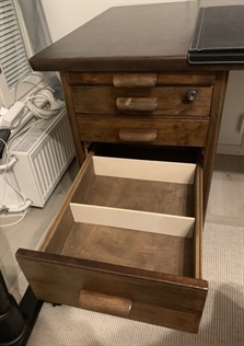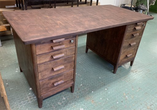 Pöydän kansi vaati useamman kerroksen lakkaa kun se piti aluksi hioa puulle asti että sai kaikki rinkulat pois näkyvistä. Laatikostoissa tein vain pintahiontaa ja petsillä kosmeettisia korjailuja joten kaksi kerrosta lakkaa riitti hyvin.