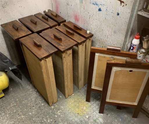 Laatikostojen vuoro saada lakka pintaan. Osa seinistä on saanut enemmän auringonvaloa kuin toiset osat. Erilaisia tummuusasteita nähtävissä. Hyvä tehdä näitä lakkahommia illalla niin ei ole pölyä ilmassa niin paljoa.