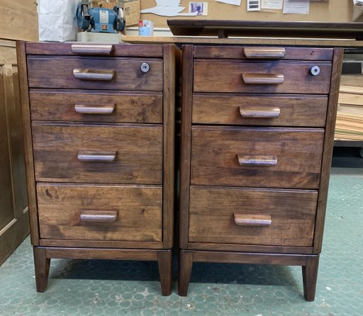 Hiontaa ensimmäisen ruskean petsin jälkeen, sitten punaista petsiä, hieman hiontaa ja lopuksi eebenpuun väristä petsiä. Alkaa olla aika lähellä laatikoiden väriä.