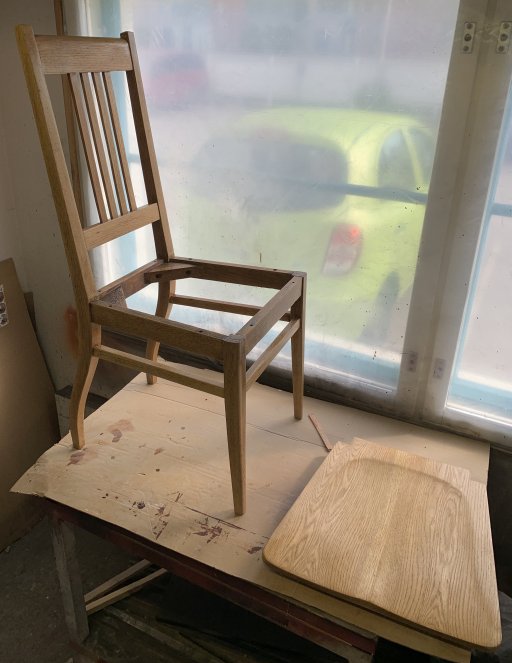 Kuvassa pahimmat on jo sipaistu pois kun tutkin että kannattaako alkaa tekemään enempiä hommia tämän eteen. Muuten siis ehjä ja tukevan oloinen tuoli.