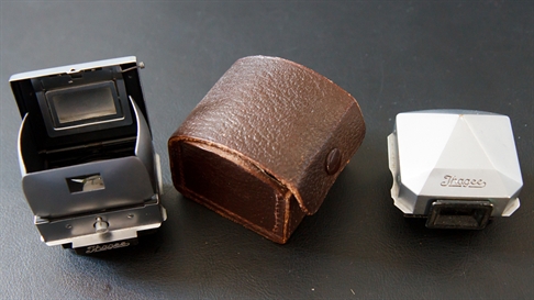 Etsin on vaihdettavissa helposti koska se on irroitettavissa. Vaihtoehtoina on tavallinen prisma ja toisena tuollainen avoin ylhäältä katseltava malli. Ns. vyötärötason etsin. Sitä käyttäessä kuva näkyy oikeinpäin mutta vasen on oikealla ja päinvastoin.